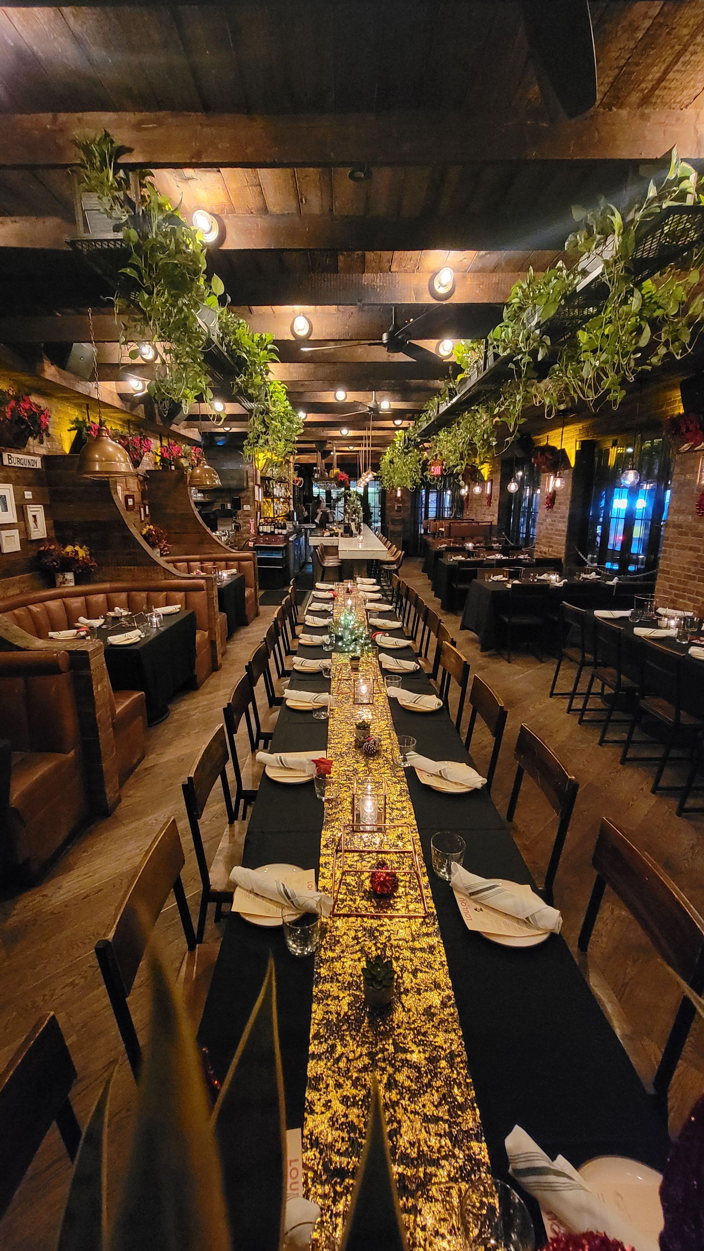 The Main Dining Room: Experience the warm atmosphere of a traditional Parisian bistro combined with rustic, modern, and industrial touches reminiscent of a chic NYC loft. Featuring exposed beams, cascading greenery, and warm woods, it's ideal for group brunches, lunches, or dinners enjoying expertly crafted French cuisine and cocktails.